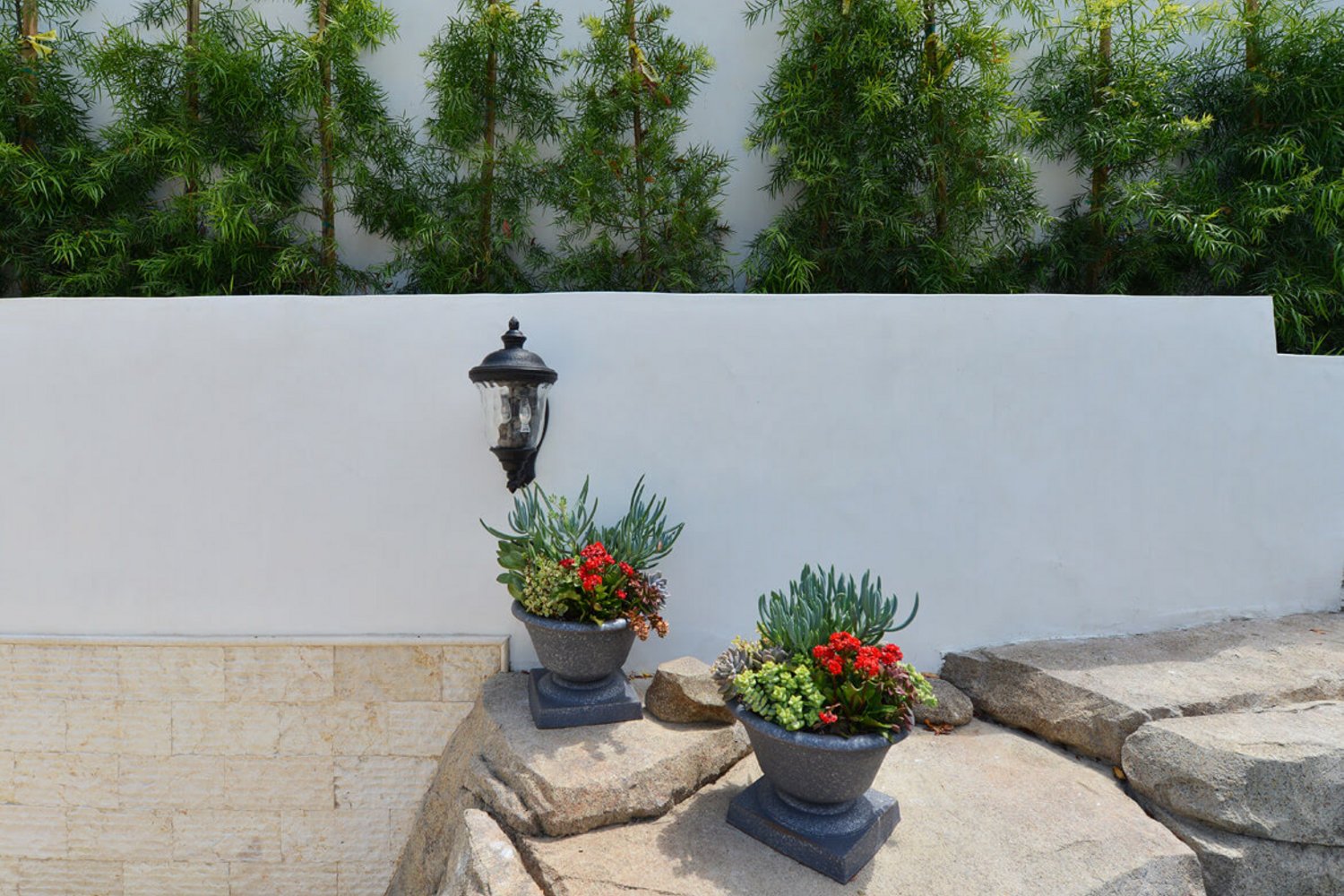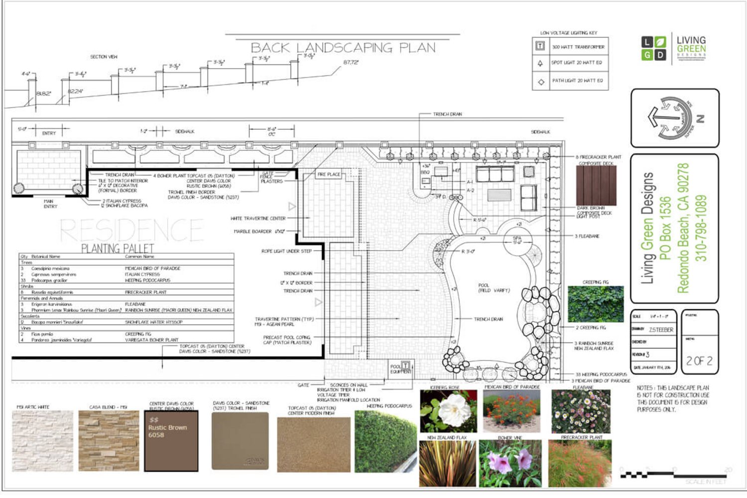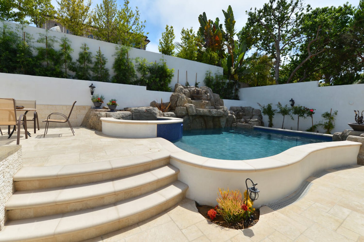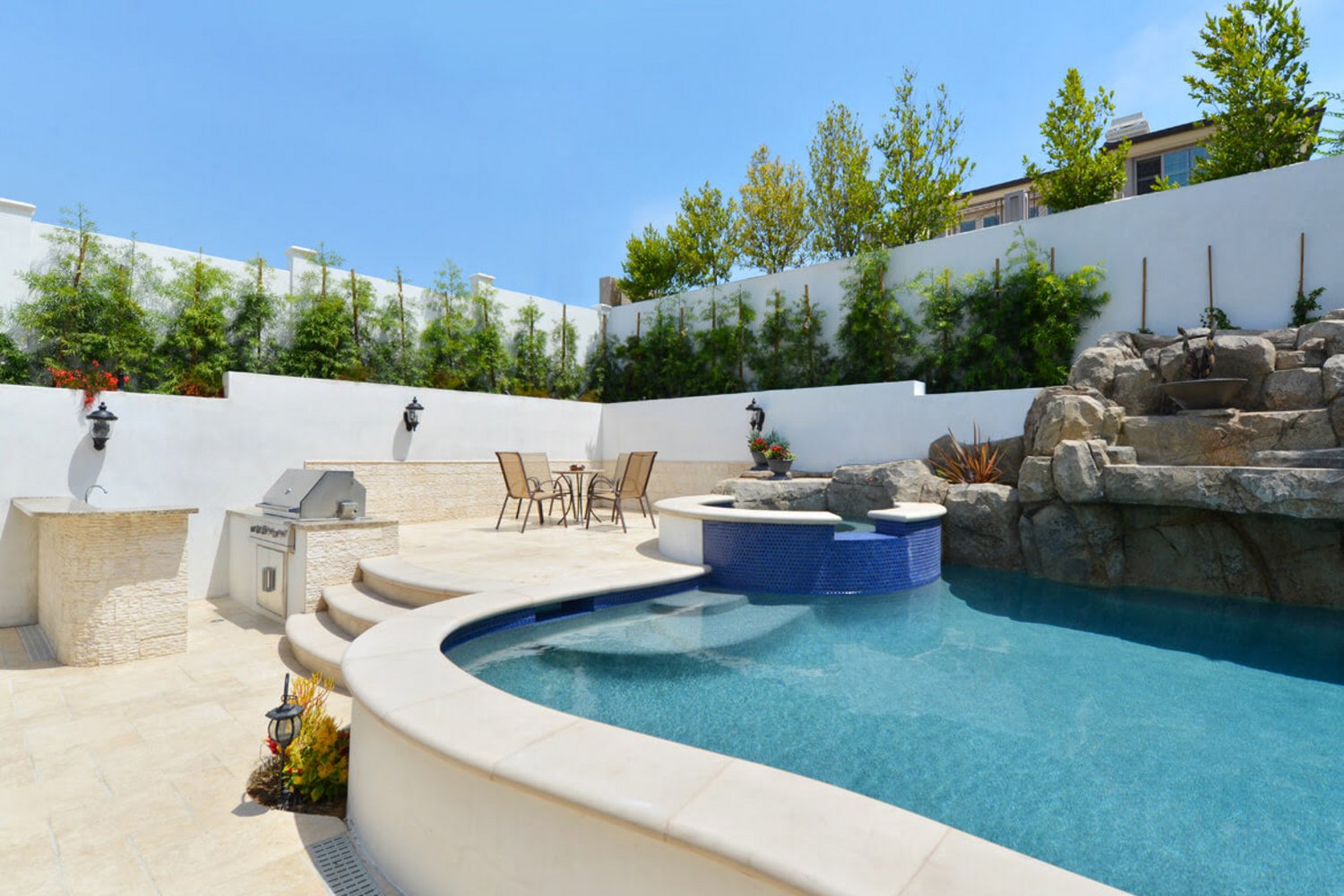 The focus of this backyard paradise is leisure. Every inch was meticulously planned out around entertainment and relaxation. There are three driving design choices that make this backyard sophisticated place to spend your afternoon, Sand Water and Stone. The color sand or tan was the overall color choice for covered seating patio, outdoor patios and the stacked stones walls giving a gentle and sophisticated appearance to the look and feel of the entire space. The outer walls are complimentary smooth white stucco giving the backyard an open and clean sense of existence. The second design choice, water, proves to be the main focal point of the backyard with its 9’ water fall. The gentle curves of the pools edges help remind viewers to meander about the space freely. The final design choice was stone, and stone is everywhere! Every walking surface in the backyard is covered in luxurious stone. Even the Barbeque Island is finished with heavy textured stacked stone and capped with a tan granite barbeque top. The main seating area overlooking the pool and spa is accented with stacked stone on the walls. All this stone add to the sophisticated feel of this backyard. The large stone sunning deck turns into a casual outdoor dinning room when the sun goes down. There are 3 fire features that keep guests warm during evening hours. There are 2 fire bowls around the pool and a custom build fire place under the cover patio. Between the play of the fires flames on the water and the warm glow of the LED Lights and wall scones, this backyard charms all that enter into relaxation.