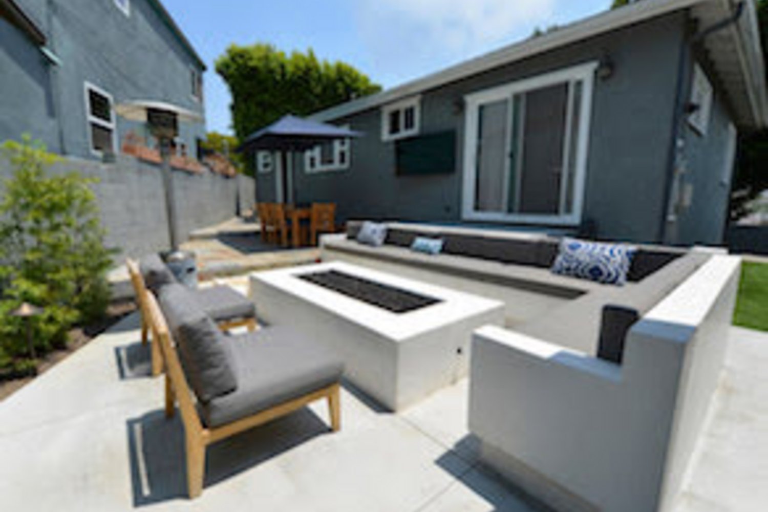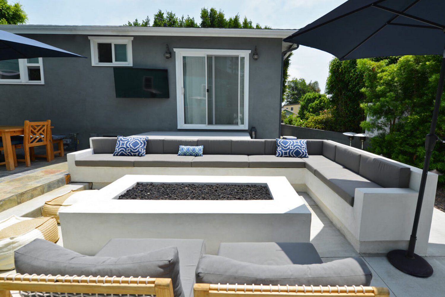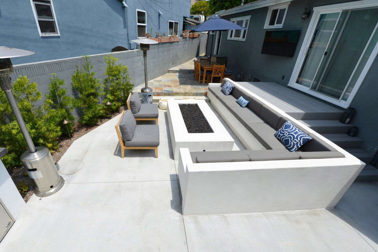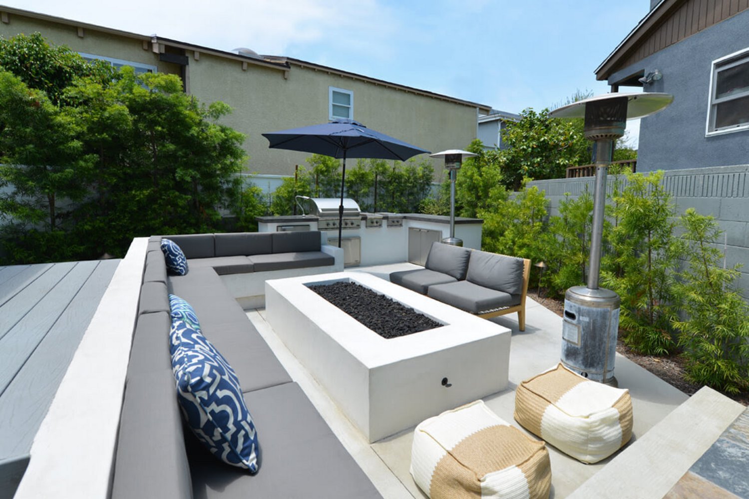 Family entertainment was the core design parameter leading this project. For this family enjoying a home-cooked meal and gathering around a fire were the main activities that brought them together. Our goal was to create a backyard that would bring the family together in a well designed space for the enjoyment of these activities. The main design style at play in this angular backyard residence was contemporary modern design. In tune with the style, a color palette of white, gray, and an accent of blue was used. The backyard layout was challenging in that the space was tiny and an irregular shaped triangular. The solution to get the most usable space out of the yard was to push the large barbeque cook island to the set back limits. This was done in order to allow for the largest patio space available for large family gatherings while making the most of the acute triangle shaped area. Across from the barbeque area sits the rest of the yard complete with a fire pit, built-in-bench, farm table eating area, and a master deck. The old wooden deck that use to take up most of the old yard was replaced with a suitably sized landing off the master bedroom that overlooks the fire pit. The new decking material used was a recycled, renewable material that will withstand ocean air and long hot summer days without fading and cracking, unlike traditional lumber. The existing patio spaced was enhanced with more square footage of tile to accommodate a farm table that seats up to eight people. Since eight is the minimum amount of guests in attendance at gatherings, a large seating bench was designed to seat up to 12 additional guests around the fire pit. To balance the oversized seating bench, an eight foot fire pit was designed and installed just below the dining area. This client enjoys grilling so a 12’ custom barbeque island complete with warming trays, refrigerator, double burner and a 42” barbeque was design and installed. Consistent with the design palette, the barbeque is finished with a custom built dark gray polished concrete counter top. Warm LED landscape lights, hidden rope lights, and the fire pit collectively create an inviting ambience that transitions the festivities from daytime into the evening. This backyard brings the class leisure of a boutique hotel home in the comfort of your backyard.