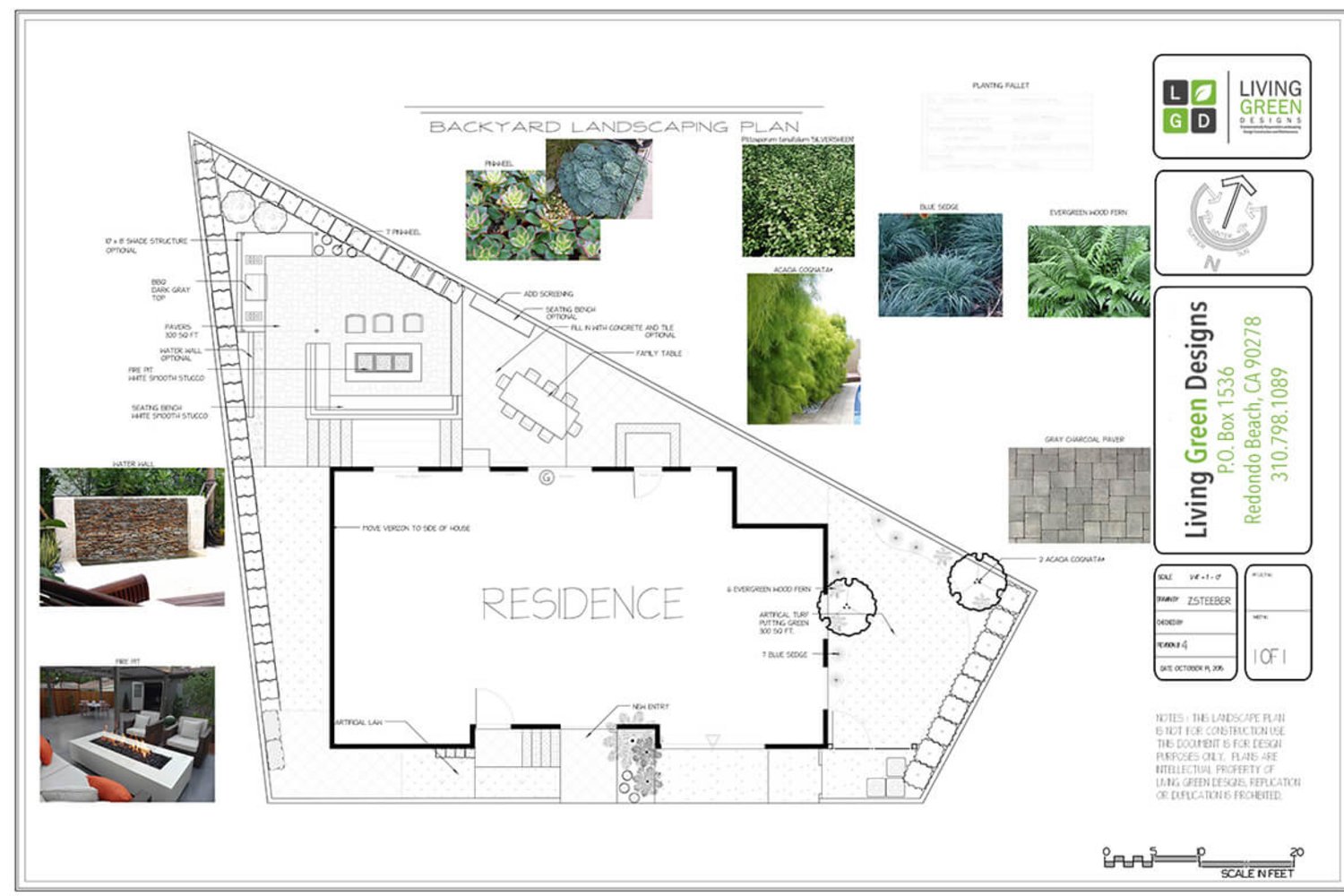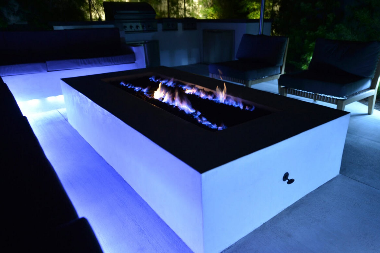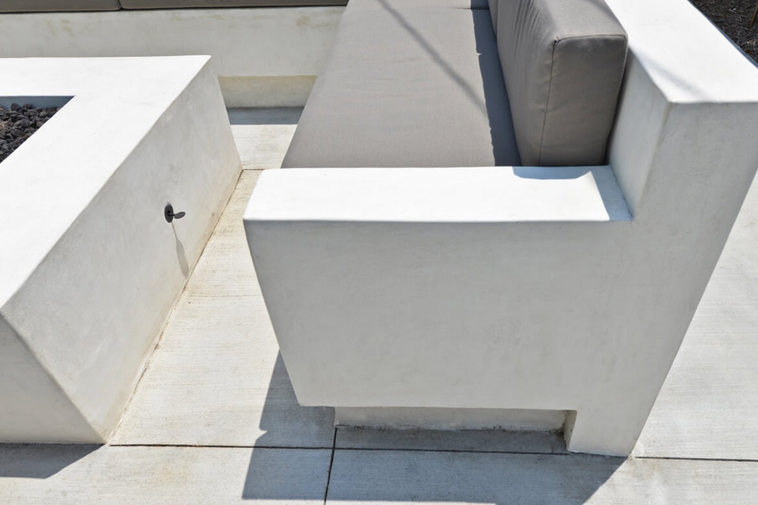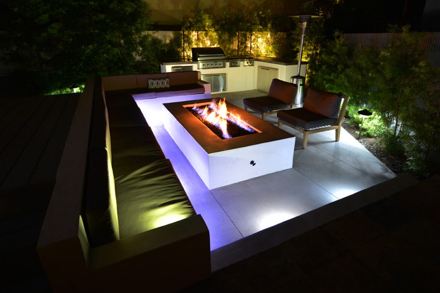 Family entertainment was the core design parameter leading this project. For this family enjoying a home-cooked meal and gathering around a fire were the main activities that brought them together. Our goal was to create a backyard that would bring the family together in a well designed space for the enjoyment of these activities. The main design style at play in this angular backyard residence was contemporary modern design. In tune with the style, a color palette of white, gray, and an accent of blue was used. The backyard layout was challenging in that the space was tiny and an irregular shaped triangular. The solution to get the most usable space out of the yard was to push the large barbeque cook island to the set back limits. This was done in order to allow for the largest patio space available for large family gatherings while making the most of the acute triangle shaped area. Across from the barbeque area sits the rest of the yard complete with a fire pit, built-in-bench, farm table eating area, and a master deck. The old wooden deck that use to take up most of the old yard was replaced with a suitably sized landing off the master bedroom that overlooks the fire pit. The new decking material used was a recycled, renewable material that will withstand ocean air and long hot summer days without fading and cracking, unlike traditional lumber. The existing patio spaced was enhanced with more square footage of tile to accommodate a farm table that seats up to eight people. Since eight is the minimum amount of guests in attendance at gatherings, a large seating bench was designed to seat up to 12 additional guests around the fire pit. To balance the oversized seating bench, an eight foot fire pit was designed and installed just below the dining area. This client enjoys grilling so a 12’ custom barbeque island complete with warming trays, refrigerator, double burner and a 42” barbeque was design and installed. Consistent with the design palette, the barbeque is finished with a custom built dark gray polished concrete counter top. Warm LED landscape lights, hidden rope lights, and the fire pit collectively create an inviting ambience that transitions the festivities from daytime into the evening. This backyard brings the class leisure of a boutique hotel home in the comfort of your backyard.