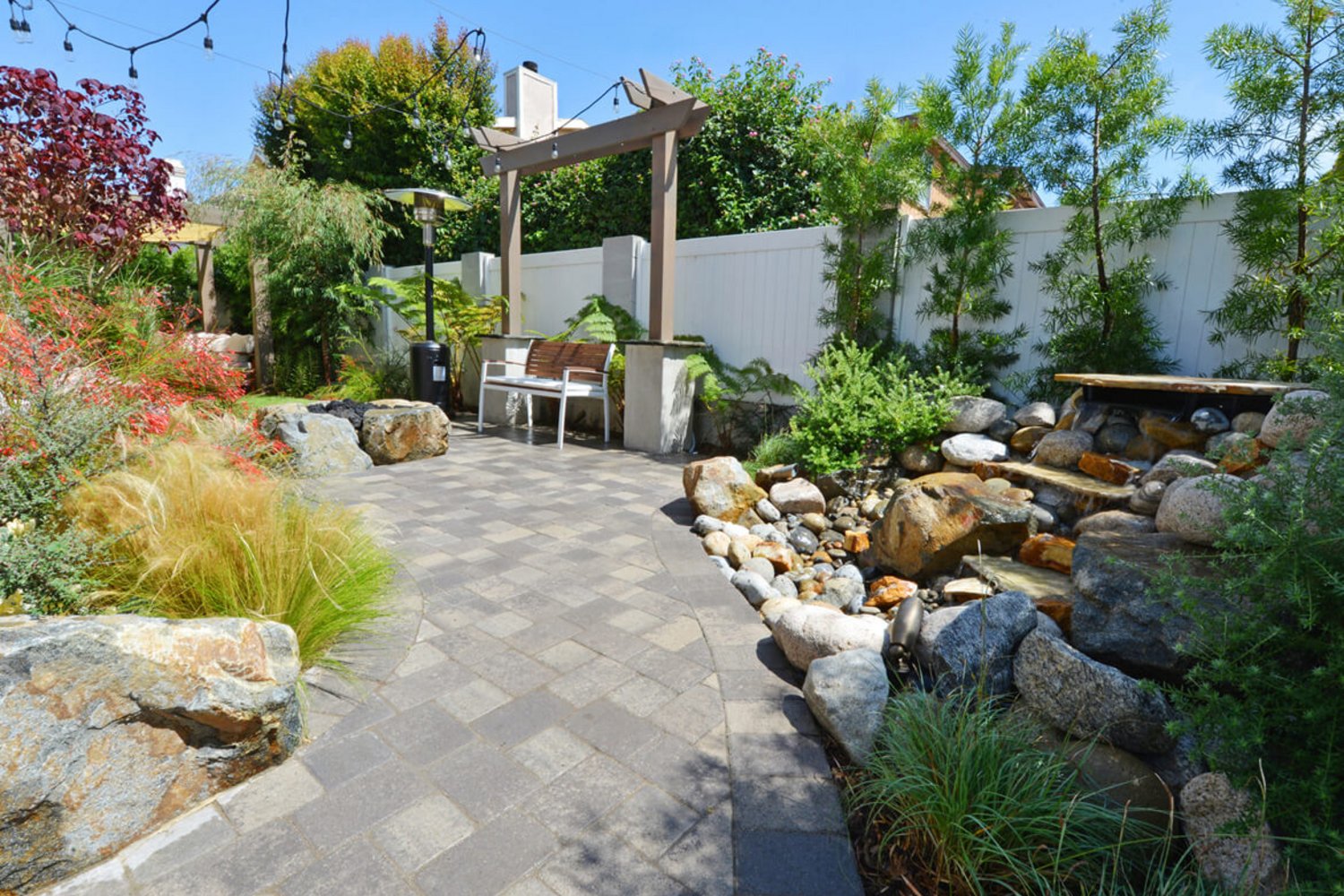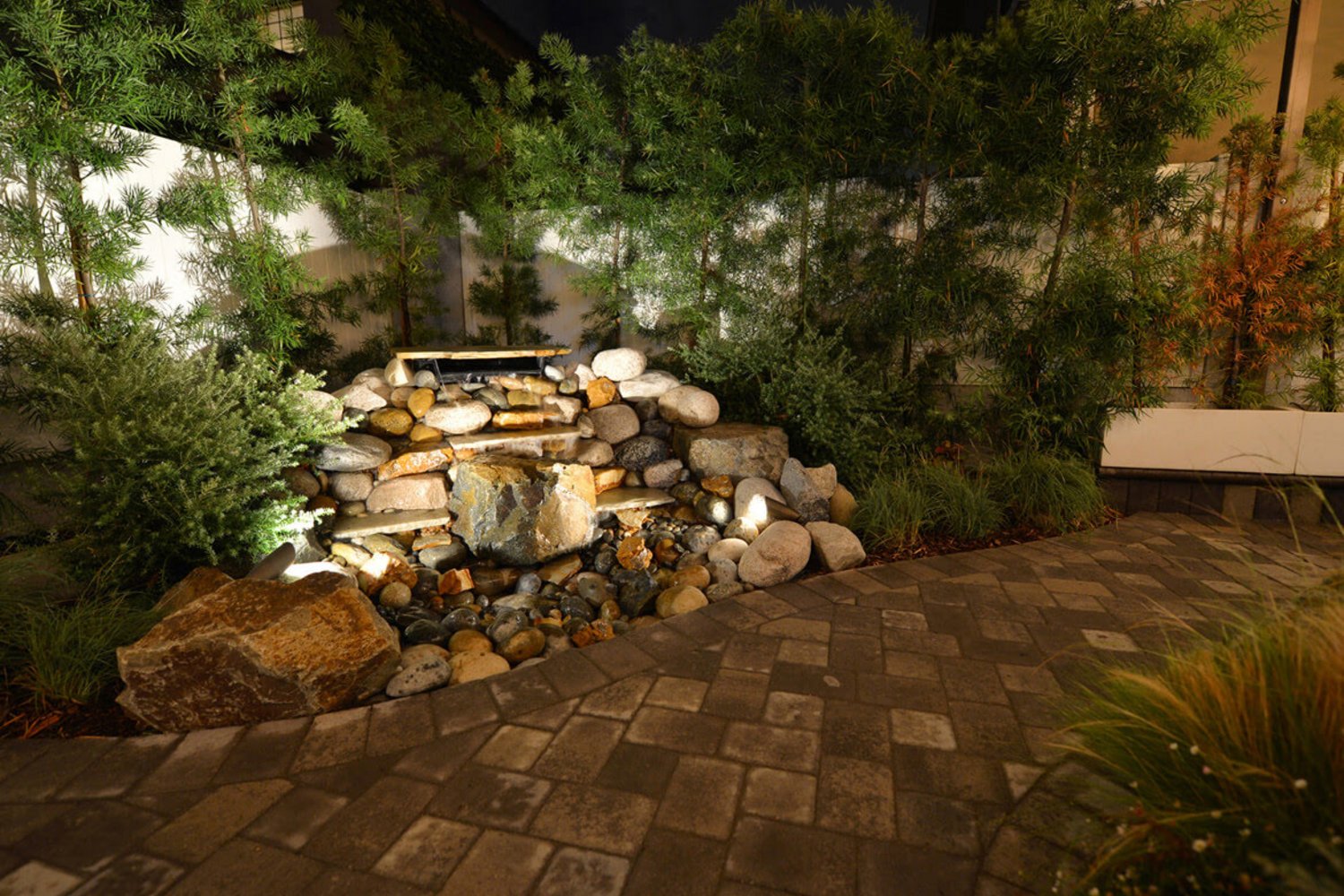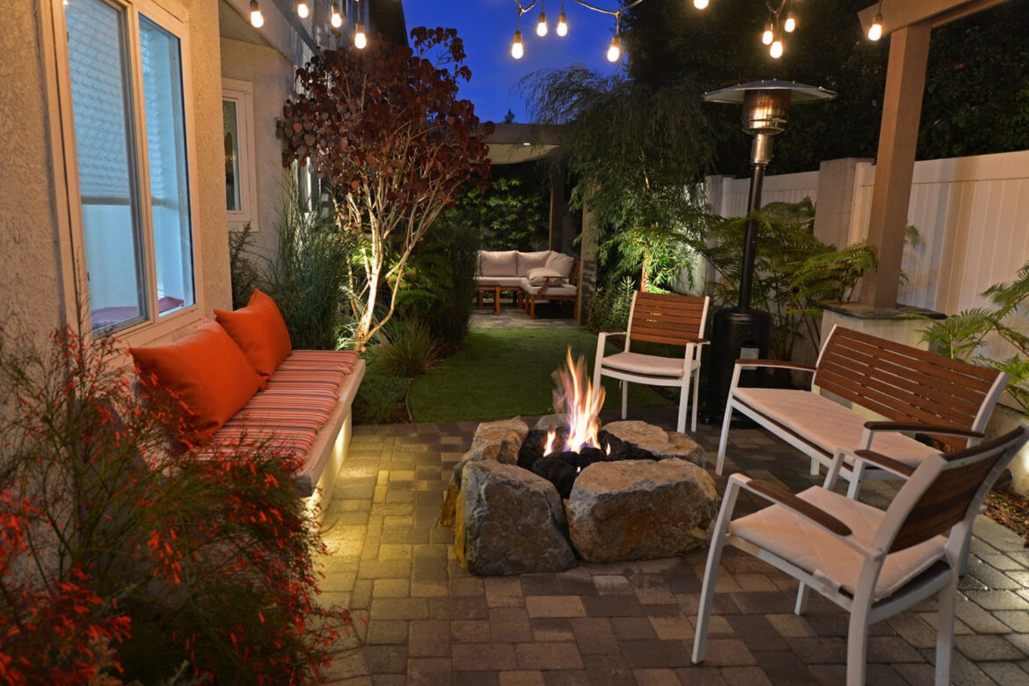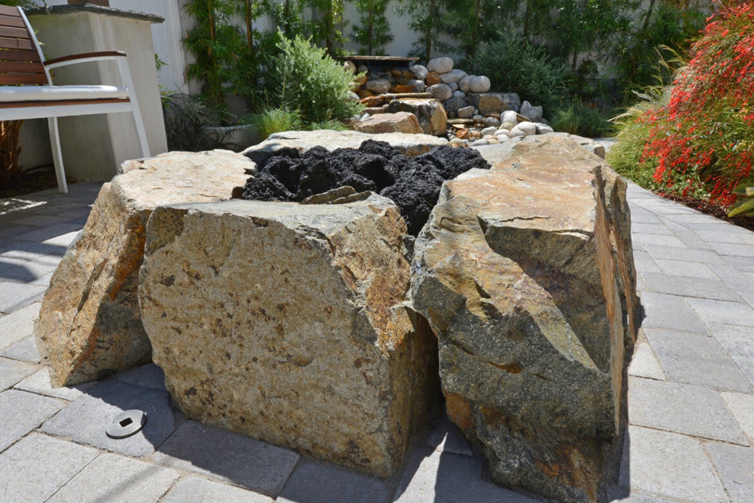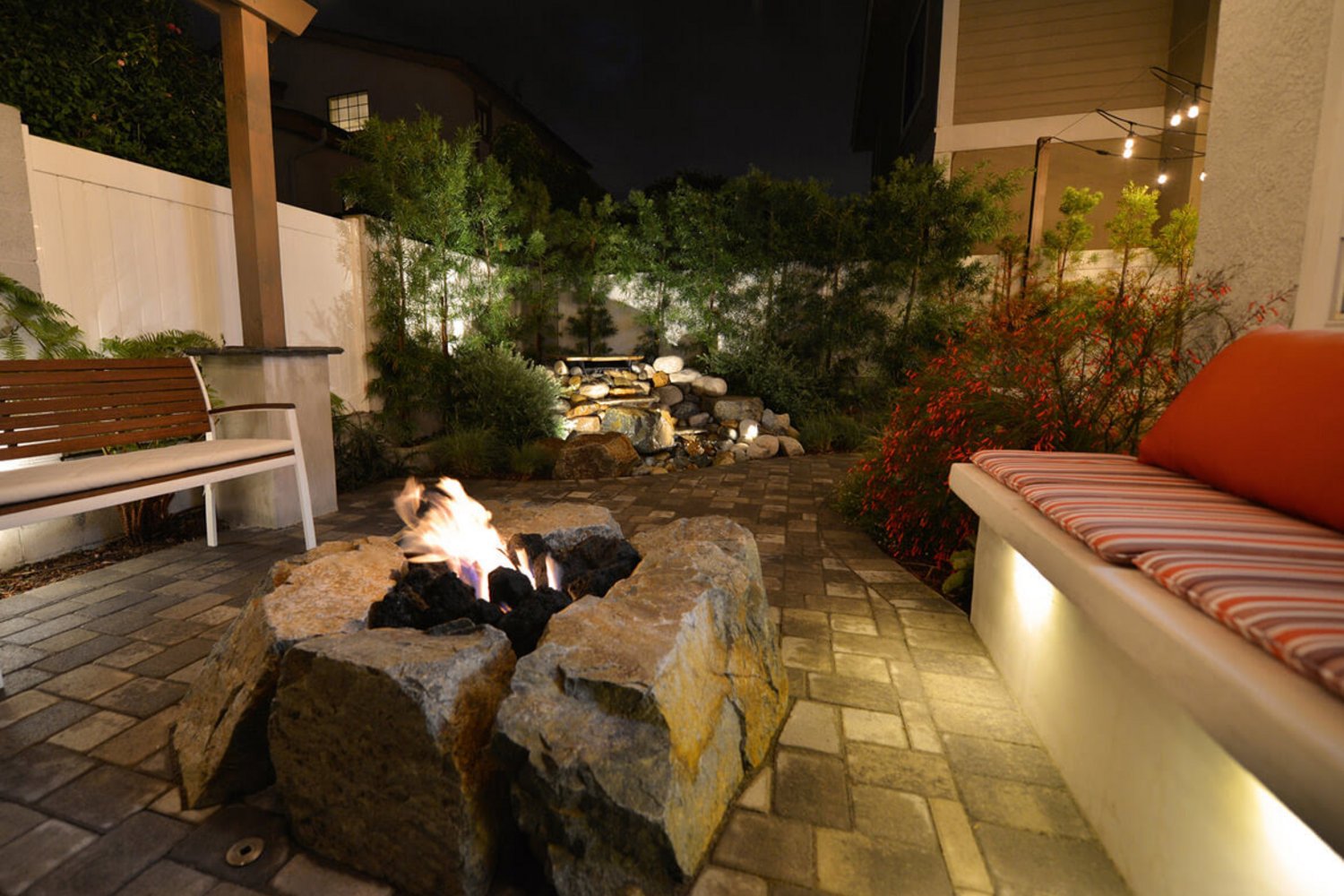 In this backyard space, the design challenge was to bring the essence of the California Mountains to Redondo Beach. As this client is an avid outdoorsman, he wanted to bring the a feel of the Sierra Nevada mountains, his happy place, home to create his very own backyard mountain retreat. Our team sourced materials that one would find in the mountains of California whilst keeping a lounge feel in mind for the secondary design criteria, a retreat. In this retreat, we created four distinct areas: the lounging area with covered pergola, fire pit area with built-in seating bench and overhead trellis complete with carnival lighting, central waterfall, and barbeque area with picnic table and overhead carnival lighting. We built a 10” x 10” rugged pergola was built out of sustainably sourced pine. The massive posts feel as though large pine trees were harvested right out of the California Mountains and crafted right on-site. The pergola was built with a retractable shade cloth so the sun can be let in for warmth in open during the colder months. The pergola and the other hard-scaped areas in the backyard were covered with a mix of gray granite and charcoal pavers. This color selection is reminiscent of the colors in California granite. Walking north from the pergola toward the fire pit area there is a mass planting of deer grasses, assortment of ferns and California coffee berries planted to mimic California Chaparral. At the other edge of this chaparral garden, sits the Cresta Boulder fire pit. Boulders were used to create this fire pit to harness the feeling of being outdoors in the wilderness. The boulders were locally sourced out of the Sierra Nevada mountain range for authenticity. In order to frame the space we installed a trellis and off the trellis runs carnival lights for night time parties. Just beyond the fire pit sits a granite boulder water fall. The waterfall is placed so that wherever you are in the yard you can see and hear the tranquil sounds of the babbling water as it circulates and recycles. The barbeque area is nestled against the backdrop of a dark green fernleaf podocarpus hedge. During the day, birds and butterflies traverse the native foliage and at night the sounds of the fire pit dance in harmony with the gentle sounds of water falling down granite pebbles making this backyard a true retreat from the chaotic noise of the city.