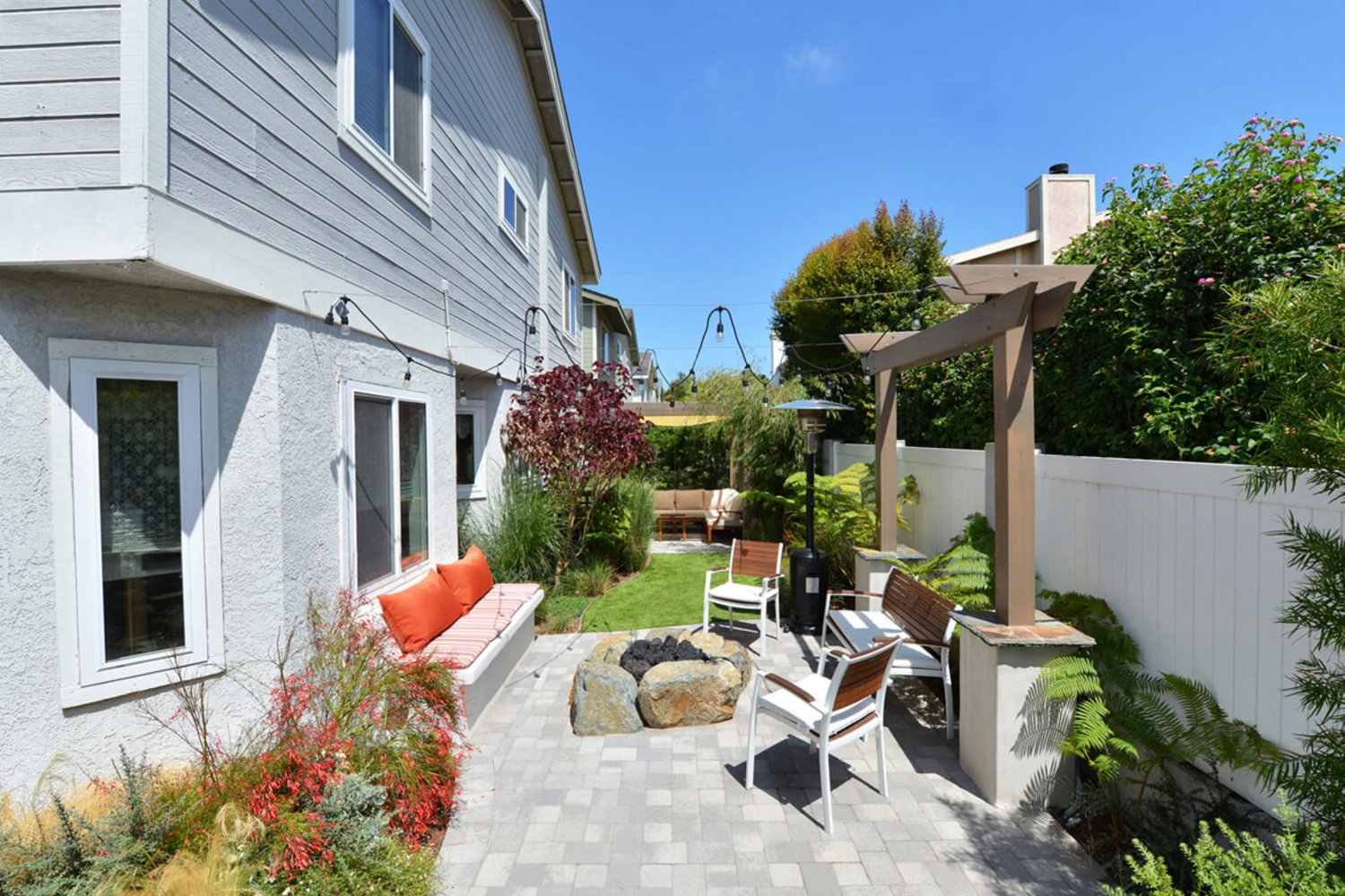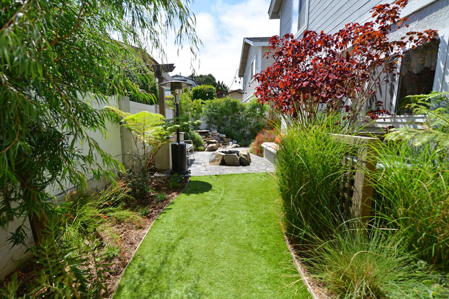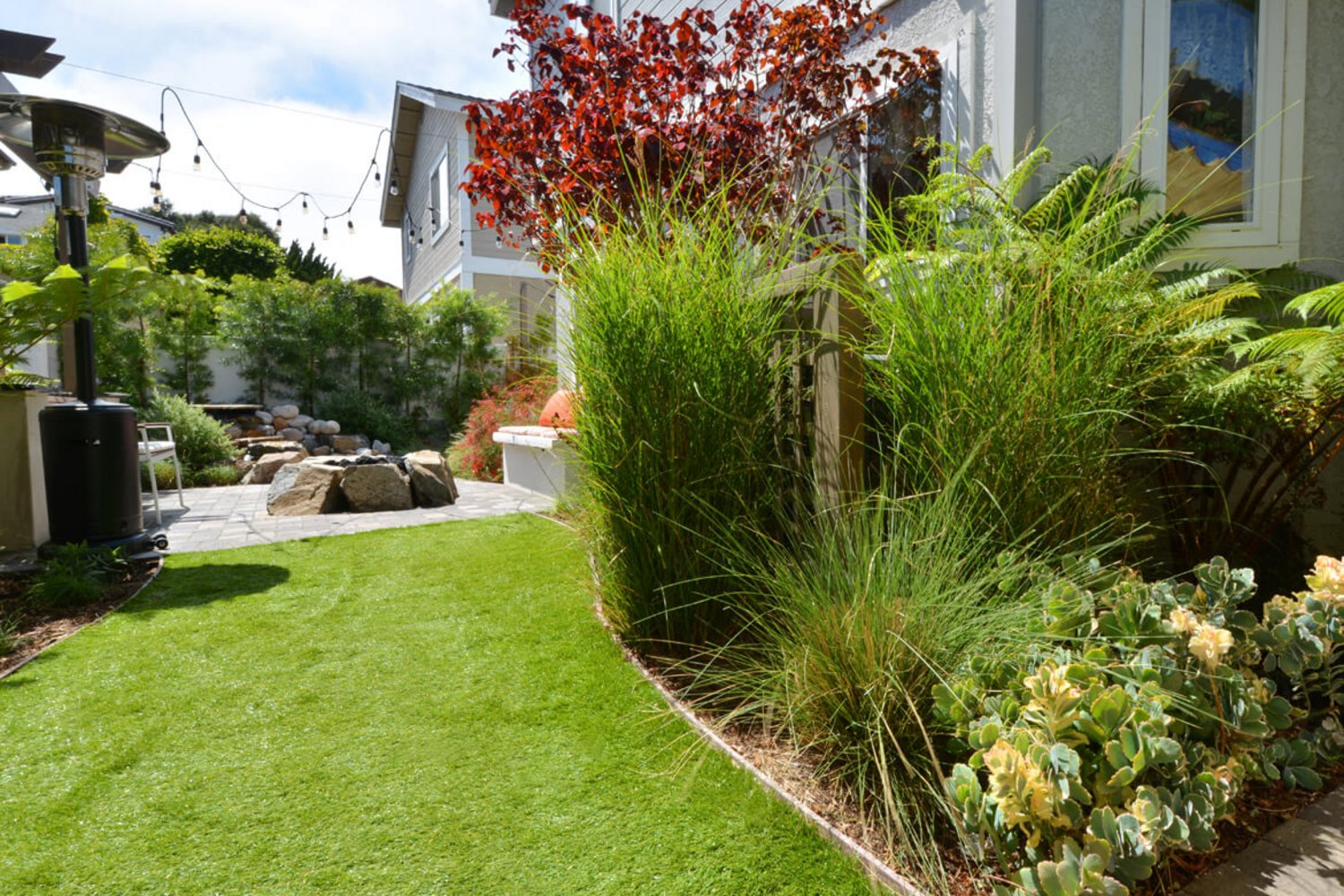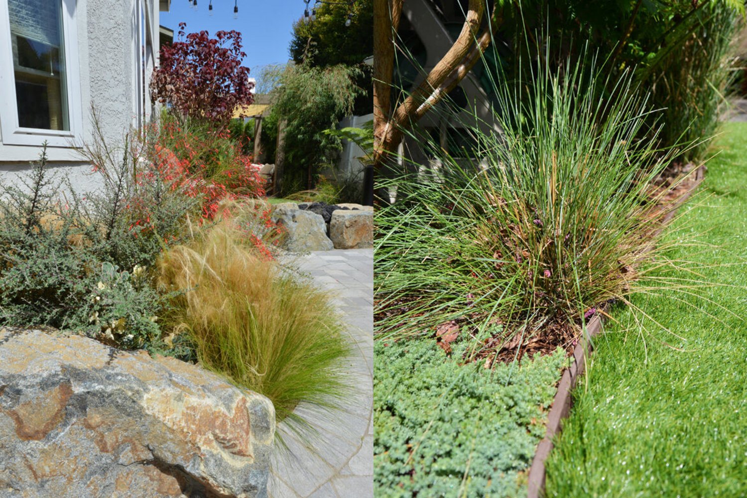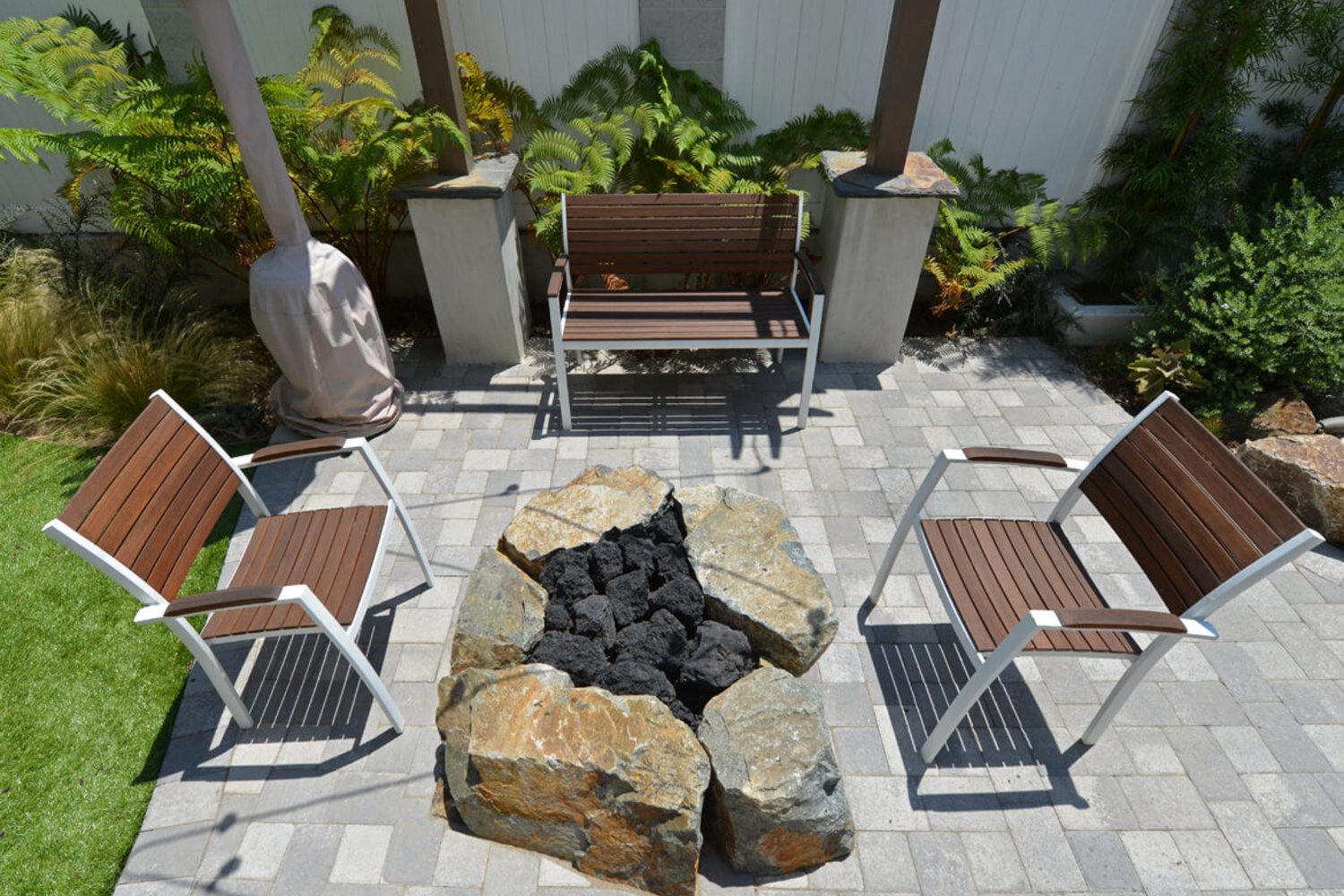 In this backyard space, the design challenge was to bring the essence of the California Mountains to Redondo Beach. As this client is an avid outdoorsman, he wanted to bring the a feel of the Sierra Nevada mountains, his happy place, home to create his very own backyard mountain retreat. Our team sourced materials that one would find in the mountains of California whilst keeping a lounge feel in mind for the secondary design criteria, a retreat. In this retreat, we created four distinct areas: the lounging area with covered pergola, fire pit area with built-in seating bench and overhead trellis complete with carnival lighting, central waterfall, and barbeque area with picnic table and overhead carnival lighting. We built a 10” x 10” rugged pergola was built out of sustainably sourced pine. The massive posts feel as though large pine trees were harvested right out of the California Mountains and crafted right on-site. The pergola was built with a retractable shade cloth so the sun can be let in for warmth in open during the colder months. The pergola and the other hard-scaped areas in the backyard were covered with a mix of gray granite and charcoal pavers. This color selection is reminiscent of the colors in California granite. Walking north from the pergola toward the fire pit area there is a mass planting of deer grasses, assortment of ferns and California coffee berries planted to mimic California Chaparral. At the other edge of this chaparral garden, sits the Cresta Boulder fire pit. Boulders were used to create this fire pit to harness the feeling of being outdoors in the wilderness. The boulders were locally sourced out of the Sierra Nevada mountain range for authenticity. In order to frame the space we installed a trellis and off the trellis runs carnival lights for night time parties. Just beyond the fire pit sits a granite boulder water fall. The waterfall is placed so that wherever you are in the yard you can see and hear the tranquil sounds of the babbling water as it circulates and recycles. The barbeque area is nestled against the backdrop of a dark green fernleaf podocarpus hedge. During the day, birds and butterflies traverse the native foliage and at night the sounds of the fire pit dance in harmony with the gentle sounds of water falling down granite pebbles making this backyard a true retreat from the chaotic noise of the city.