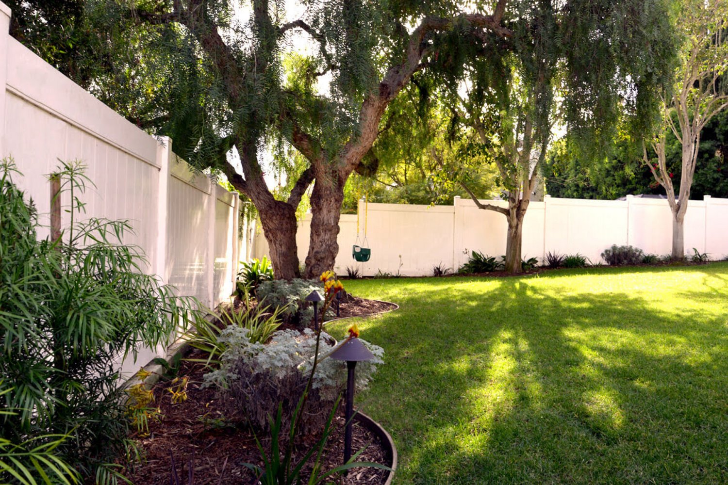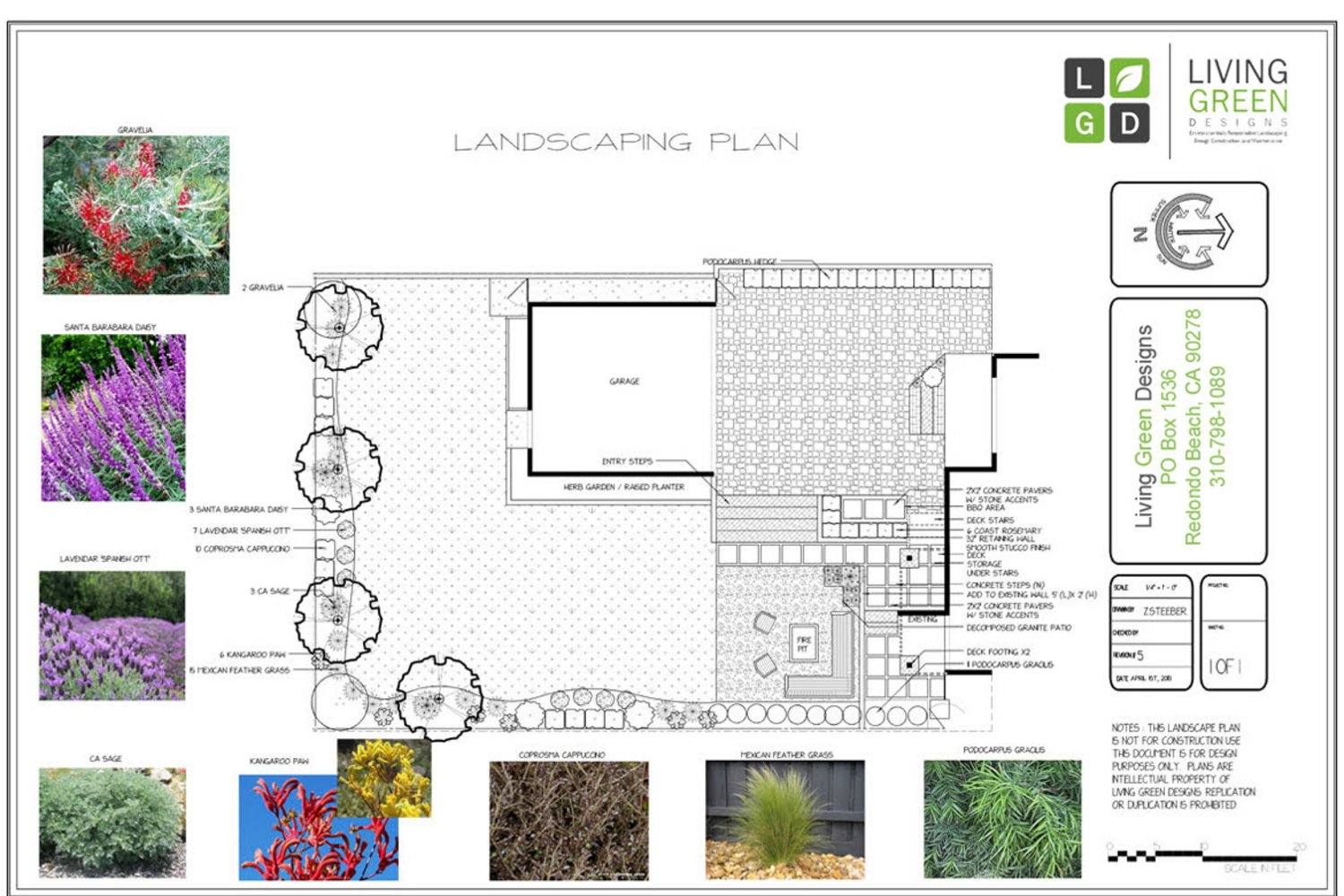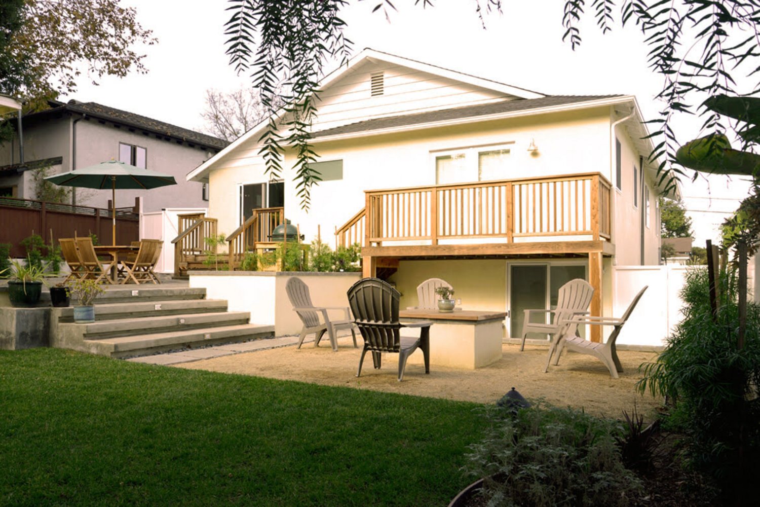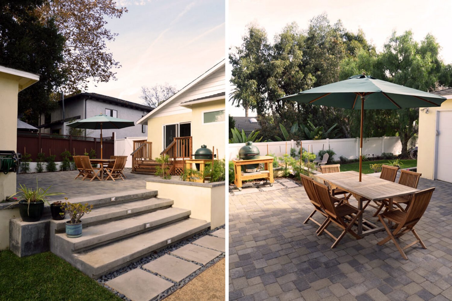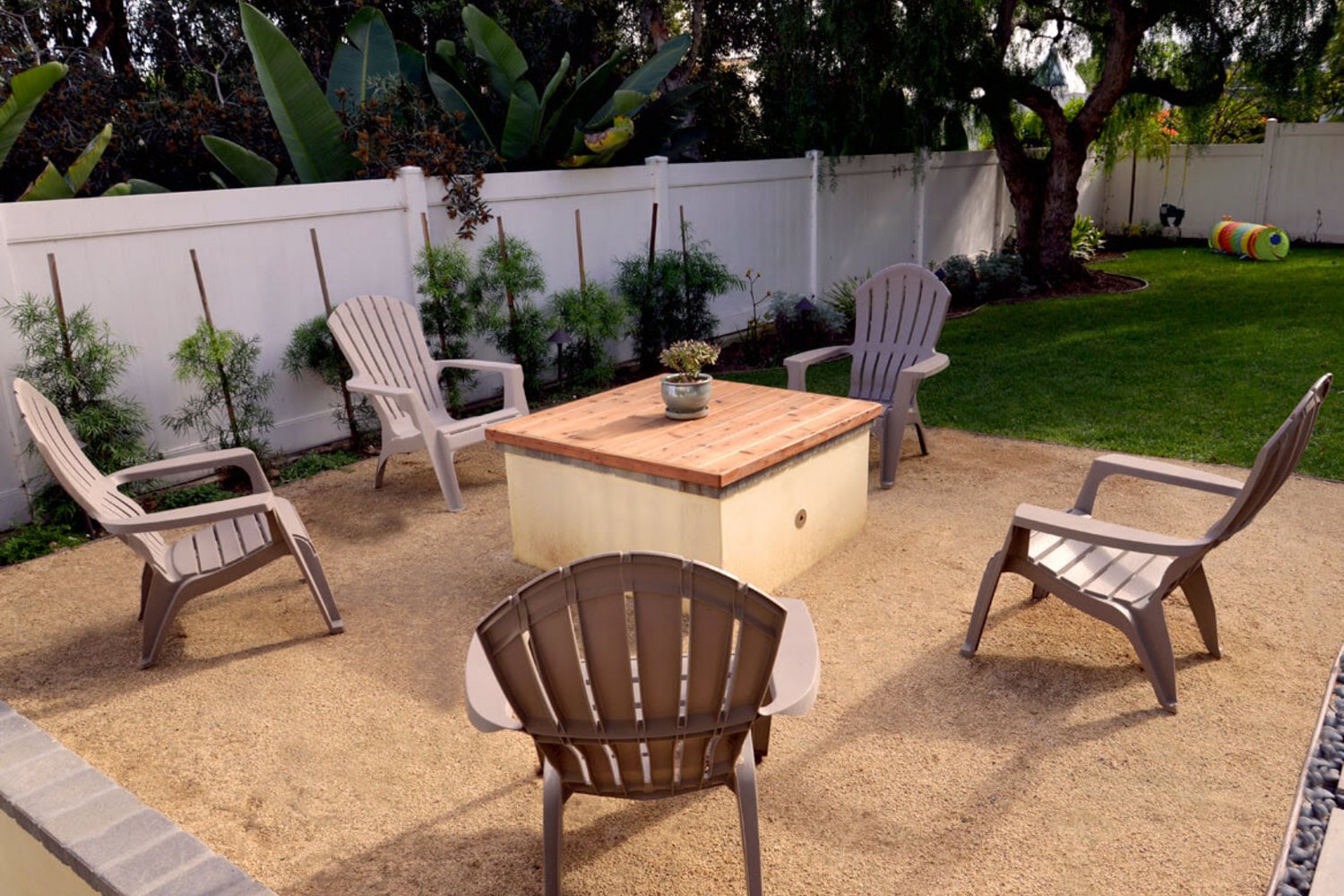The Design goal with the backyard design was to create a modern space that also harnesses the sustainable goals of the front yard landscape design. A secondary goal in line with the first was to bring the family in harmony with nature in the backyard environment. With such a vast space we began partitioning the yard into functional spaces designed for a specific use for the family. This design strategy created an outdoor space that allows the residents to utilize the backyard area to its fullest potential. The first designated area repurposes a two car garage concrete driveway as a dining and Barbeque space with permeable concrete pavers. This new permeable patio acts as an extension from the kitchen to the outdoors. The new pavers seamlessly merge as part of the landscape and add value to the outdoor dining experience in additional to recharging groundwater. The dining and barbeque area remains elevated and overlooks the second designated area, a seating area and fire pit. Modern floating stairs descend into contemporary two by two pavers that outline the edge of the fire pit area. This custom fire pit with adjoining seating brings friends and guests to a place of refuge and contemplation overlooking the fire into the expanse of the rest of the yard and vast native planting around the perimeter. This gathering area is finished with decomposed granite. Decomposed granite is a local material that is used to also promote the regeneration of ground water and reduce urban storm water runoff by allowing rain water to filter into the soil below. A custom redwood cover was built for the fire pit cover so that the fire pit could second as a coffee table in daylight hours making the space usable day and night. This fire pit/ coffee table serves as the main focal point anchoring the space. True to the first design goal the area around this gathering area is landscaped with a rolling pallet of native plants that match the pallet used in the front yard. Keeping in line with the second design goal, the backyard has three designated vegetable planters for the residence to grow their own produce.