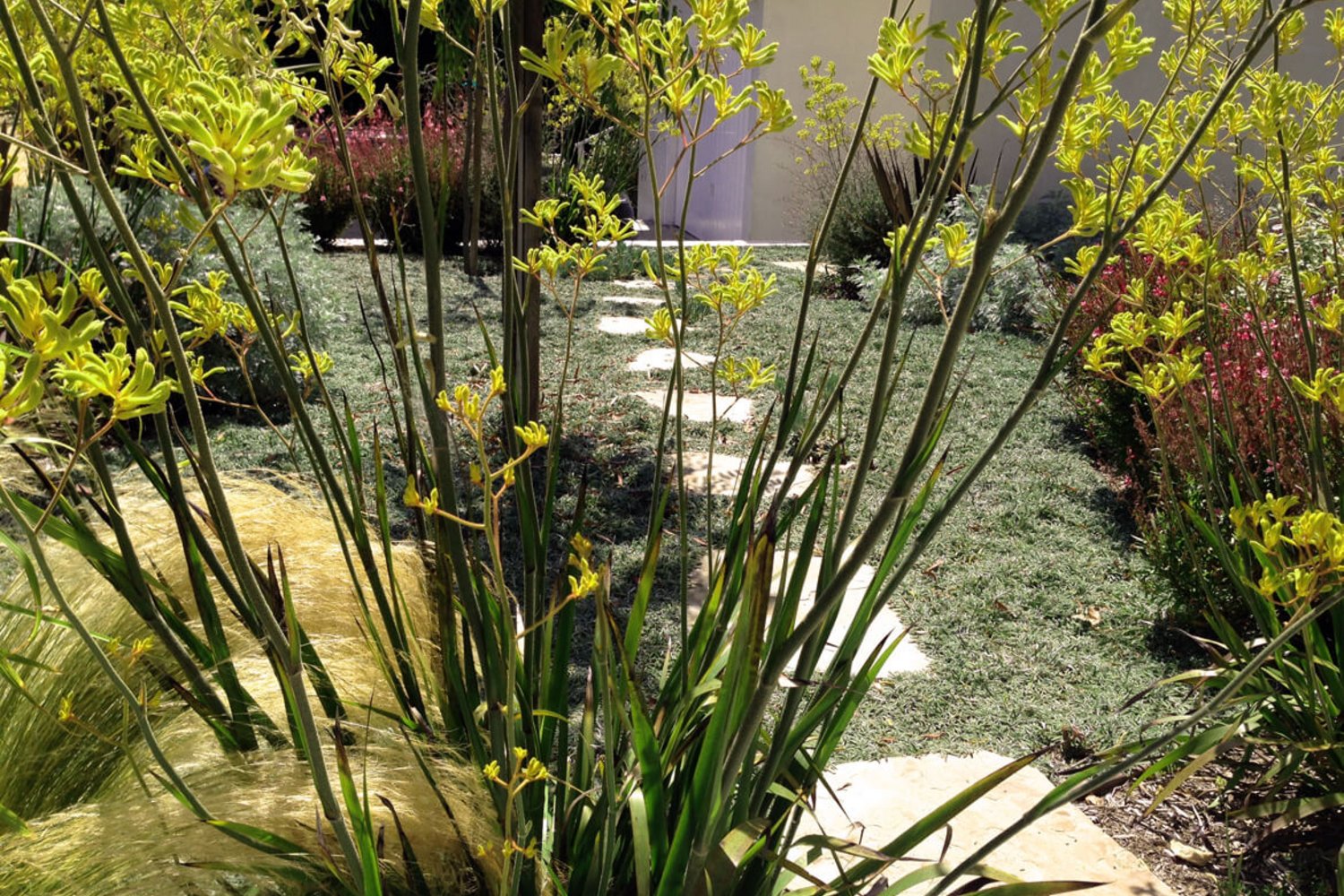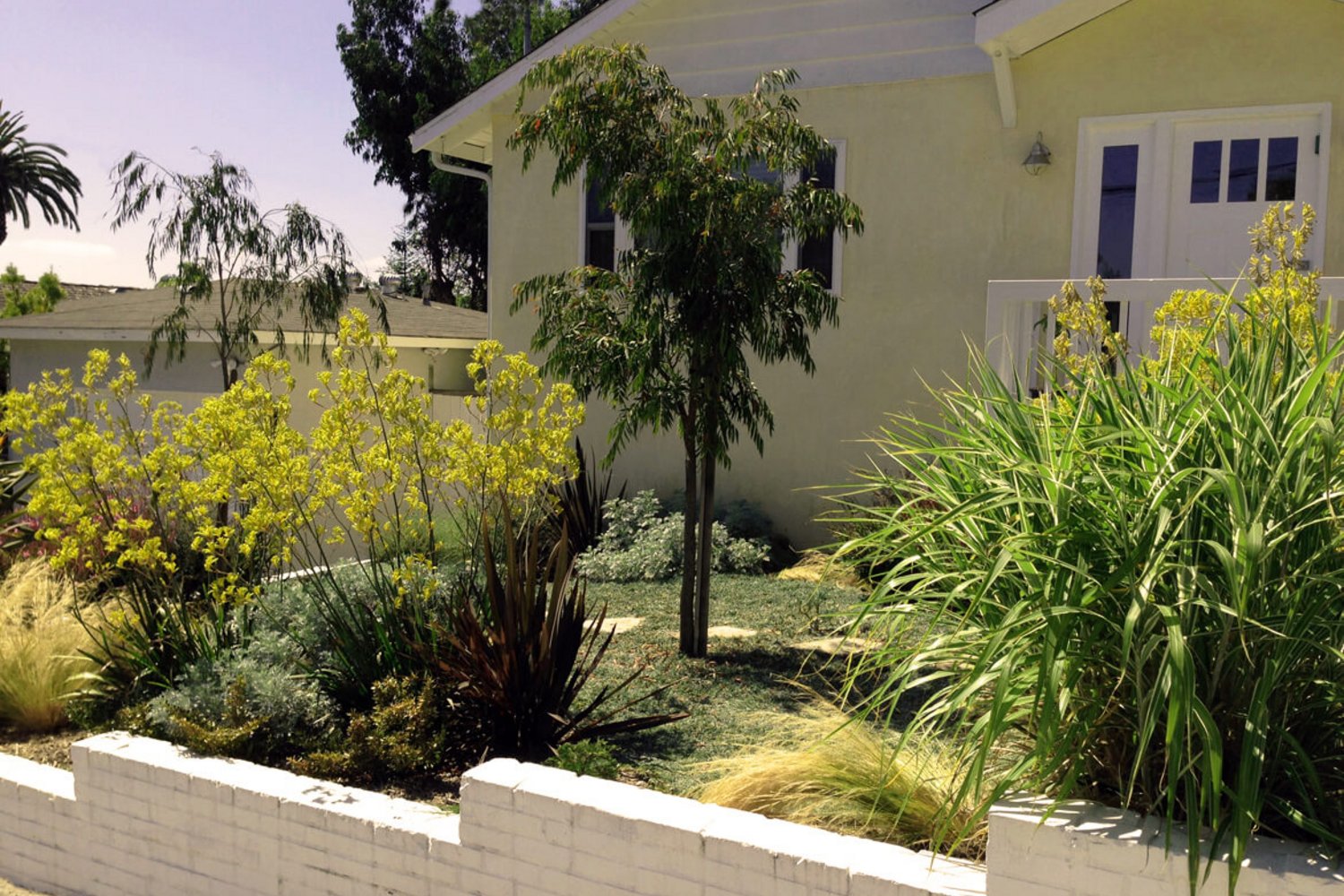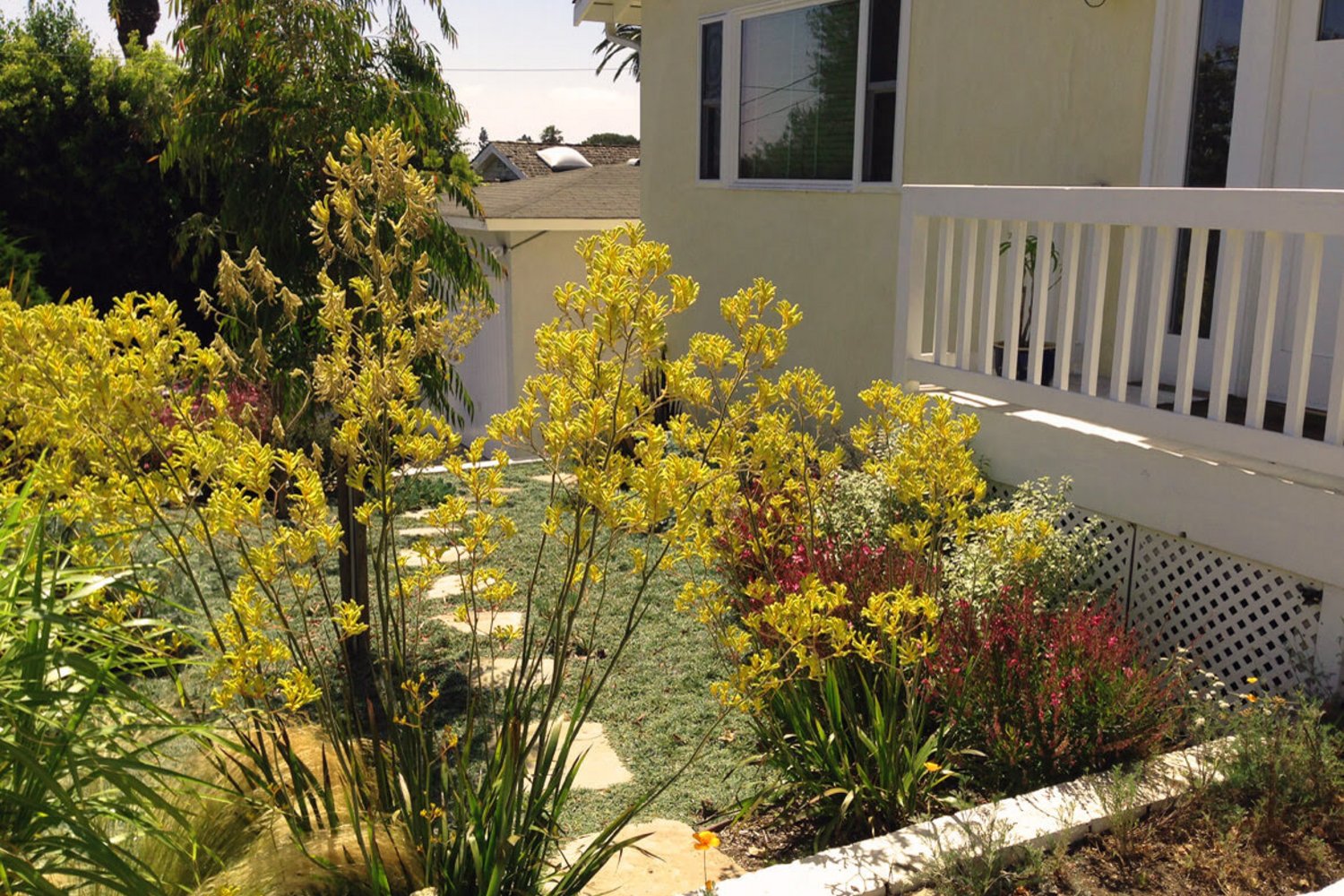 The front yard brings together sustainable landscape practices creating a planting that is inviting, colorful and vibrant. The front yard design strategy was to move away from a traditional lawn to a perennial, native palette of drought tolerant, wildlife promoting plants. The traditional lawn was replaced with a drought tolerant alternative, dymondia silver carpet ground cover that requires only supplemental water in summer months. The dymondia lawn is slopped to a catchment burm to collect rainwater onsite. This catchment helps promotes the regeneration of groundwater for the water friendly plants. The use of drought tolerant plants coupled with rain collection helps to minimize the use of water, a scarce resource in Los Angeles. In addition, the use of native and Mediterranean shrubs create a lush landscape that is vibrant in colors, textures and shape while maintaining water conservation. Using native plants also creates a microhabitat for local birds and insects adding excitement and character to the residence. Furthermore, the specific plants chosen allows for a micro drip irrigation system that replaces overhead sprinklers, a direct contrast to typical Southern California lawns which require and waste large amounts of fresh water.