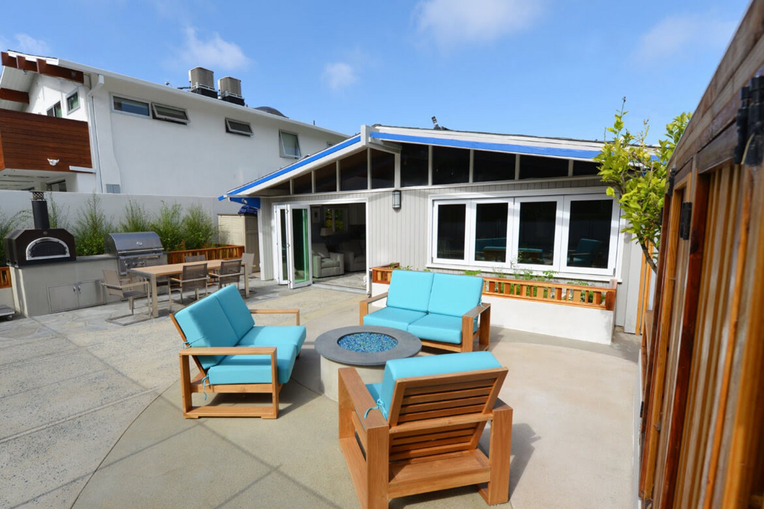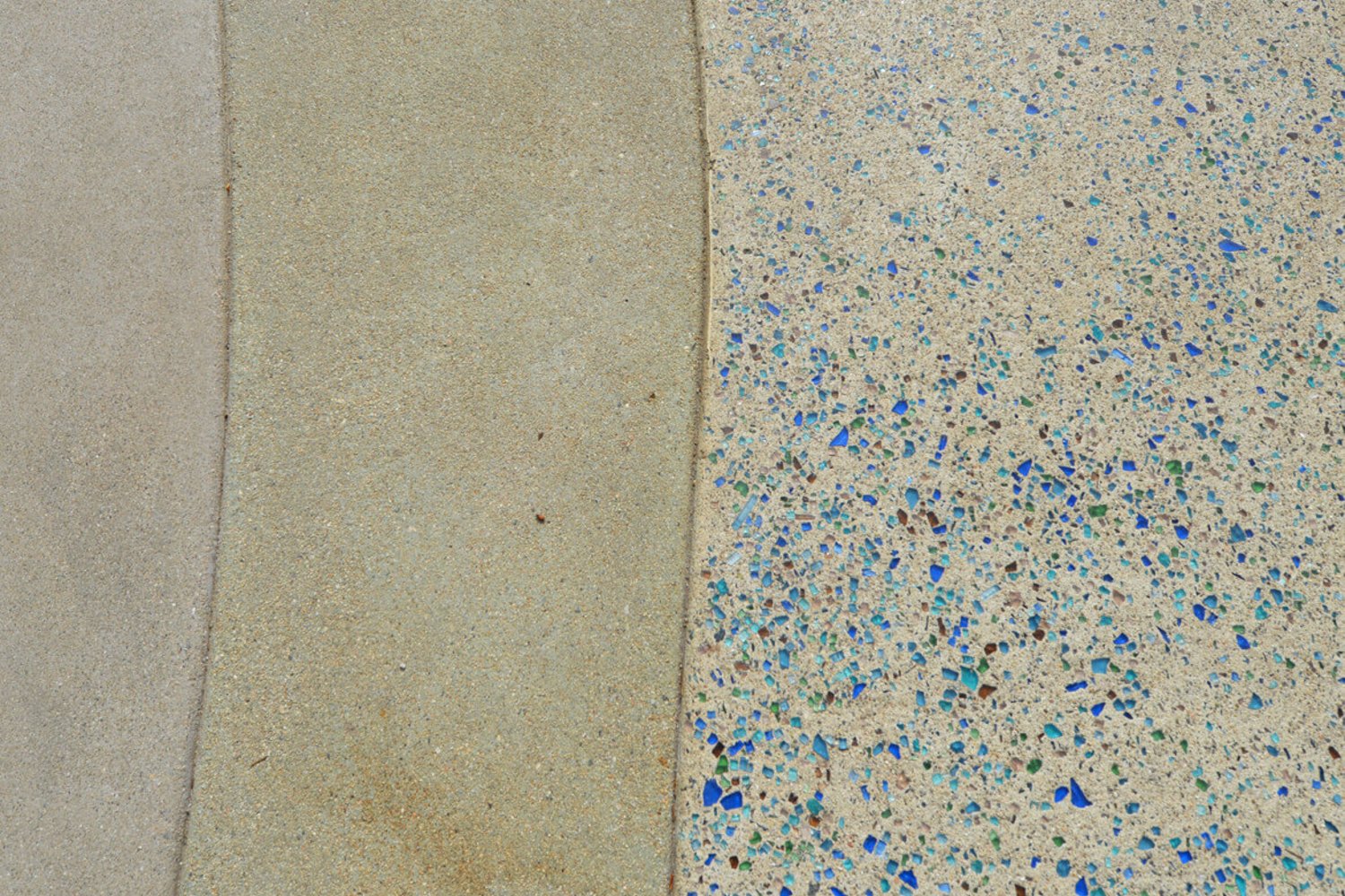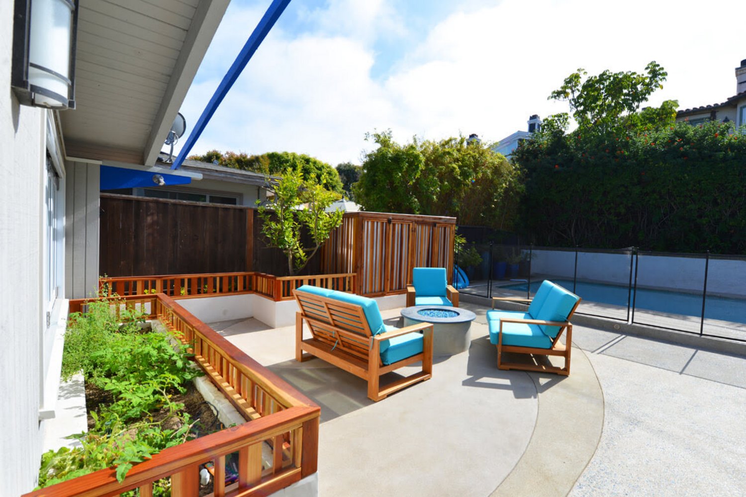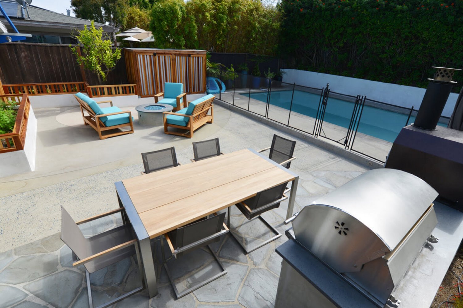 This pool backyard is the ultimate amenity and design challenge as well. The design of the landscape needed to incorporate the existing pool into the layout, to create a complimentary and balanced space. The pool deck is made up of several hardscape styles. The hardscapes are the perfect place to express styles to seamlessly match the midcentury modern architectural style. A custom polished concrete with glass feck brings a highlight of that midcentury style. Symmetrical color concrete pads that spiral into a fire pit that is filled with blue tempered glass. It’s a feature of fire and ice, making this outdoor living space a cozying place on cool evenings. Furthermore the sleek modern BBQ counter contrast with the fossil tile traditionally found during the midcentury.