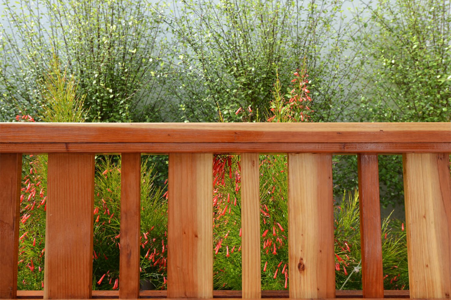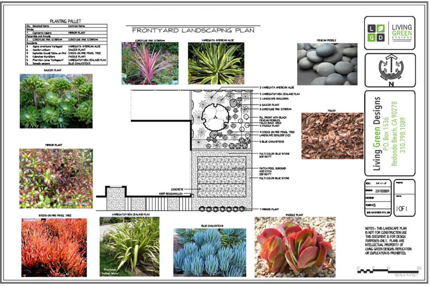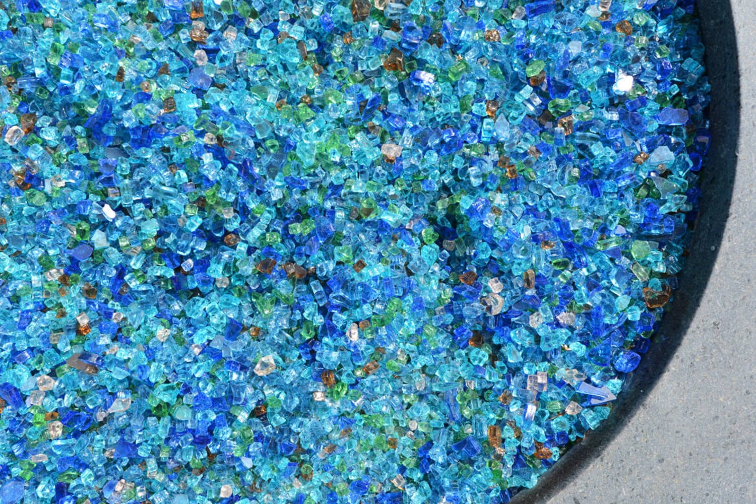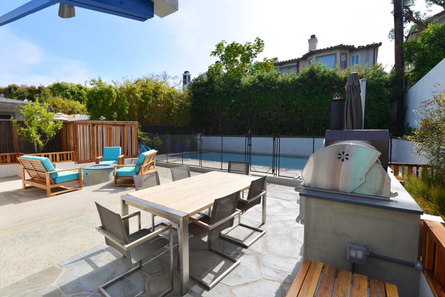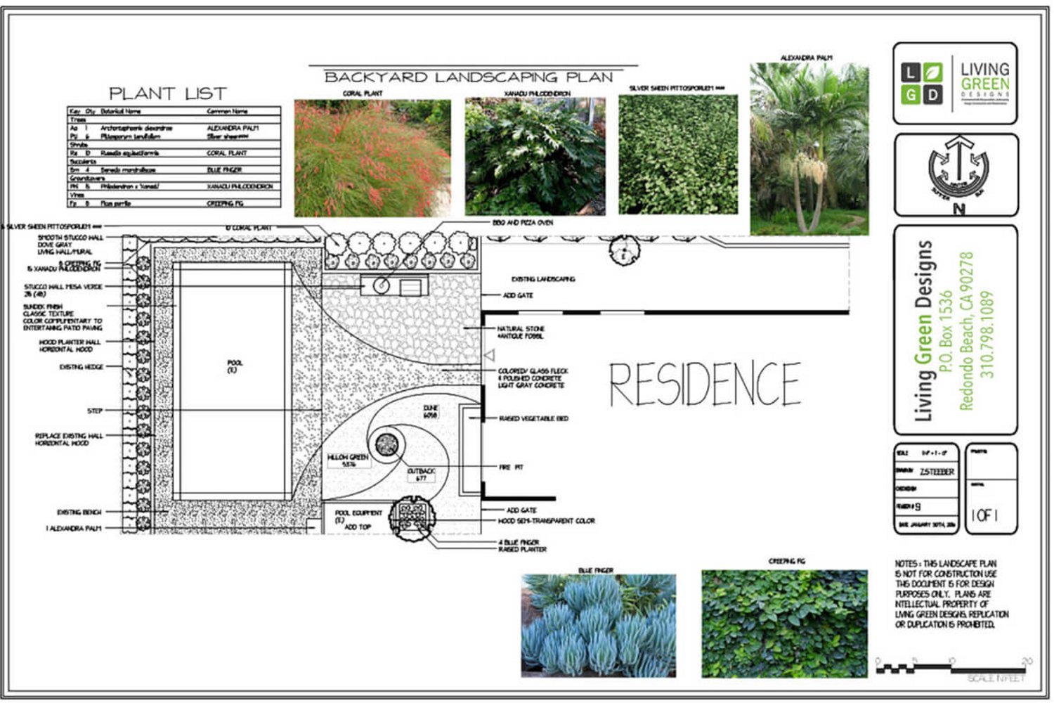 This pool backyard is the ultimate amenity and design challenge as well. The design of the landscape needed to incorporate the existing pool into the layout, to create a complimentary and balanced space. The pool deck is made up of several hardscape styles. The hardscapes are the perfect place to express styles to seamlessly match the midcentury modern architectural style. A custom polished concrete with glass feck brings a highlight of that midcentury style. Symmetrical color concrete pads that spiral into a fire pit that is filled with blue tempered glass. It’s a feature of fire and ice, making this outdoor living space a cozying place on cool evenings. Furthermore the sleek modern BBQ counter contrast with the fossil tile traditionally found during the midcentury.