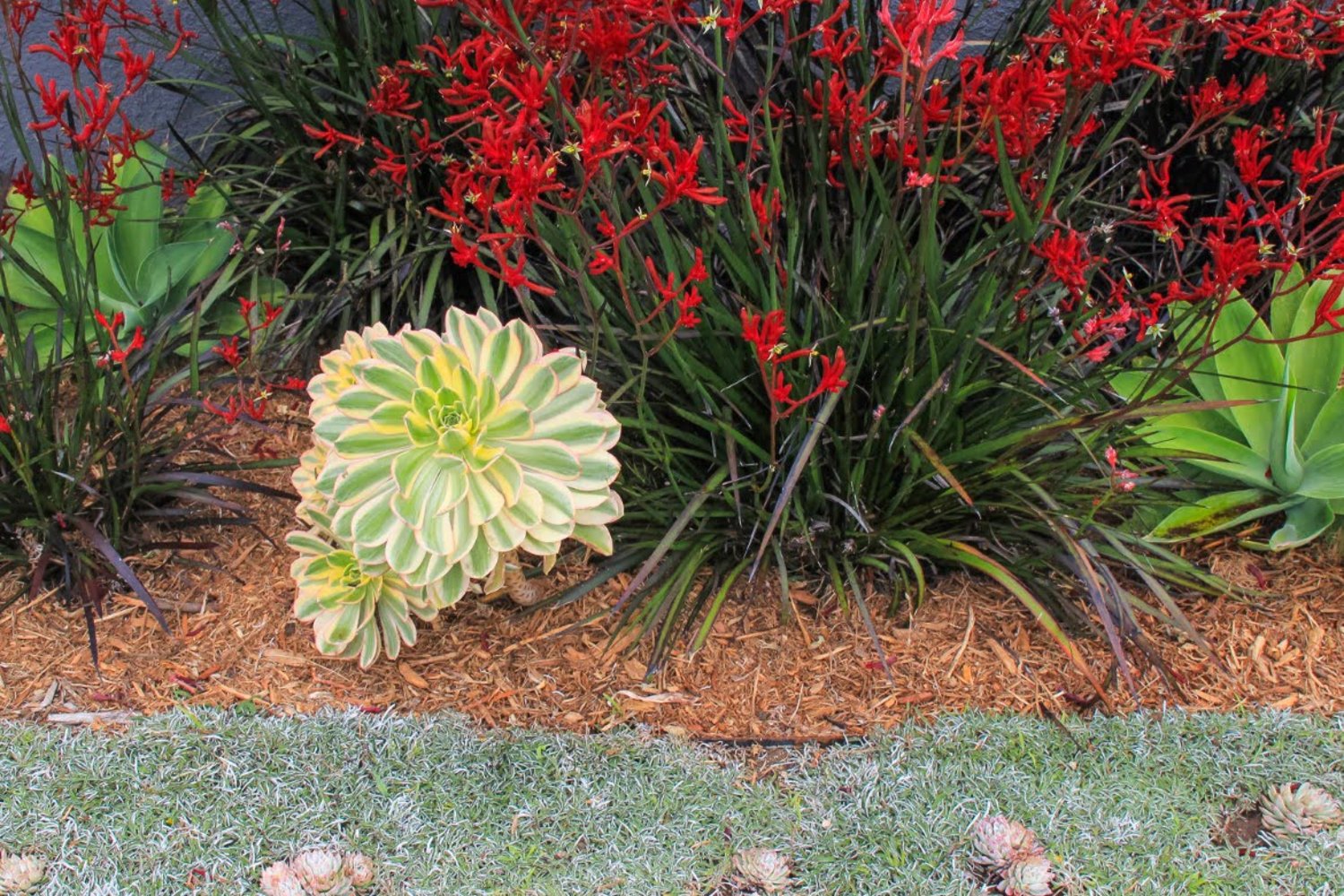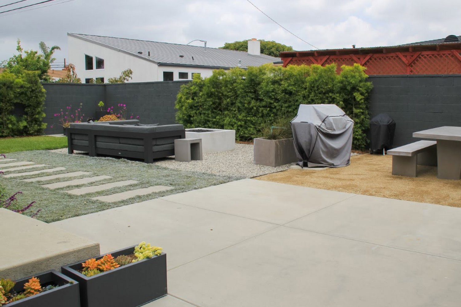 The central waterfall focal point beacons entries, rewarding those who enter a choice of the four elegant outdoor rooms. The first is the fire pit area. The fire pit lounge is the ideal space for a casual and intimate outdoor gathering or casual social group experience. Nestled into the corner of the yard the tropical plants provide a natural border and curtail the views of users, giving a sense of privacy. The next space is the elegant pergola seating area. This custom classically adorned pergola functions day or night with a custom awning, recessed night lighting and speakers for music. The next area is the barbeque and bar. The barbeque and bar serves guests with a location to congregate as well a place for dinning. An additional pergola overtop of this space gives shelter during hot days and a structure for string carnival lights to stretch the gatherings into the night time hours. The final space serves as a sunning deck and for large gathering that require multiple dinning tables. More patio space was added to accommodate for large function and social gathers in this space. When not serving social gatherings, this space is sectioned into an outdoor room with its own allure and seating arrangement. The entire backyard was landscaped with a mix of drought tolerant plants with tropical flare, including king, pygmy date, and kentia palms trees. Keeping in line with the tropical theme, annual plants were added in key focal areas for added vibrate colors. Custom landscape lighting was done throughout each of the five areas of interest for nighttime gatherings. Notably, LED down lights illuminates the built in seating areas. LED spot lights wash the water feature with warm light. The recessed pergola lighting keeps the party going well into the evening. In closing additional sustainable achievements range from; a swalled flagstone patio space which keeps rainwater on site recharging ground water for the tropical planting, sourced local stone and wood, LED energy conserving lights, and water conserving drip irrigation for the tropical water friendly planting.