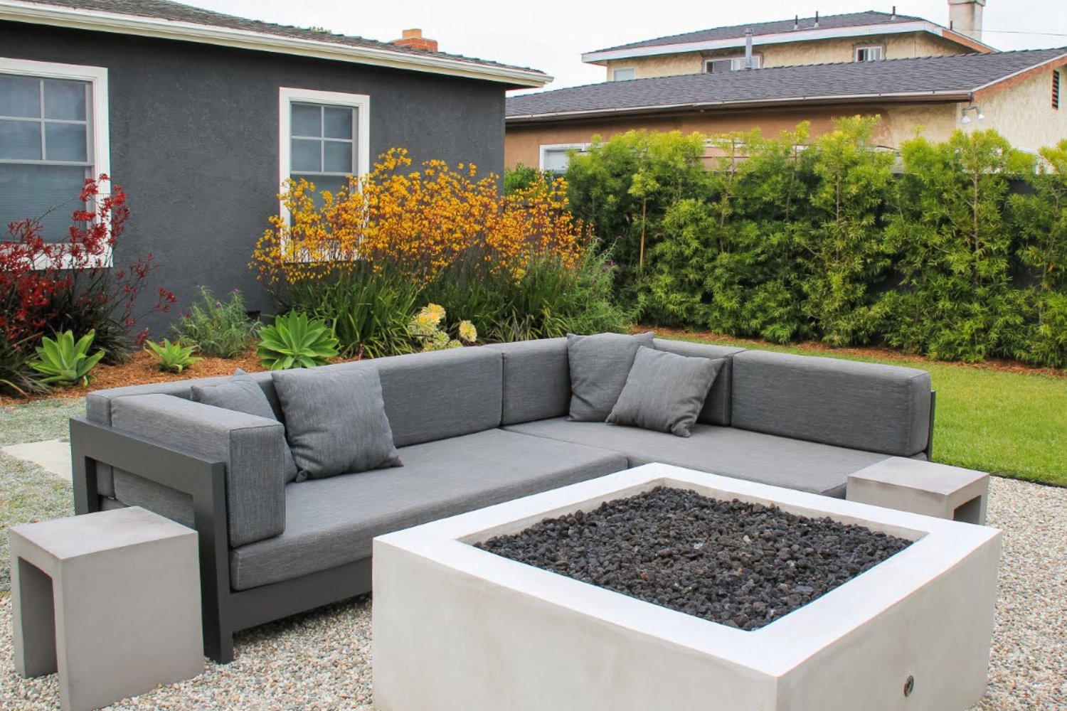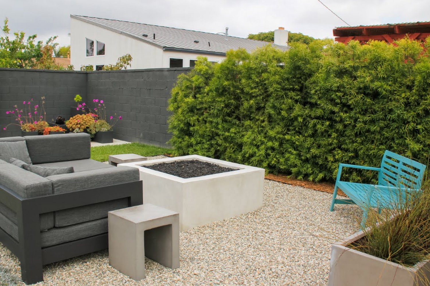The design goal at this California residence was to create an elegant entertaining space in a traditional style that would draw guests into a colorful tropical paradise sun rise or sun set. Viewable at any hour, the disappearing water feature serves as the main focal point in drawing guests outside. The water feature fills the backyard with a gentle ambiance that relaxes and calms the senses. Keeping with company goals, this water feature was sustainably built with local Palos Verdes Stone sourced 8 miles south of the residence. The water fall cascade seems as if a natural water geyser had risen from the ground and created a new oasis in the once austere yard. In addition to the water feature there are four distinct areas which include a fire pit accompanied by a built in natural stone seating bench, a classic pergola sitting area with retractable awning, a raised bar with central barbeque and outdoor dining area, and finally, a sunning deck and entertainment space adjacent to the waterfall perfect for a tranquil summer afternoon and large parties.